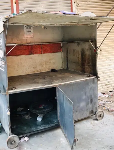 kabin ha do bare khano ka niche uper ka pora lohe ka ha mazboot or bhari ha 4 tyre lage hua ha sirif color hoga baki koi kam nh ha isme phele chiza sale kerta the is per phir panchar wala bhi betha tha is per panchar ka kam bhi ho sakta ha or easy load ka bhi kam ho sakta mechanic ko bhi betha sakta ho is per jiss ko chiya ho rabta kare ya num on ha