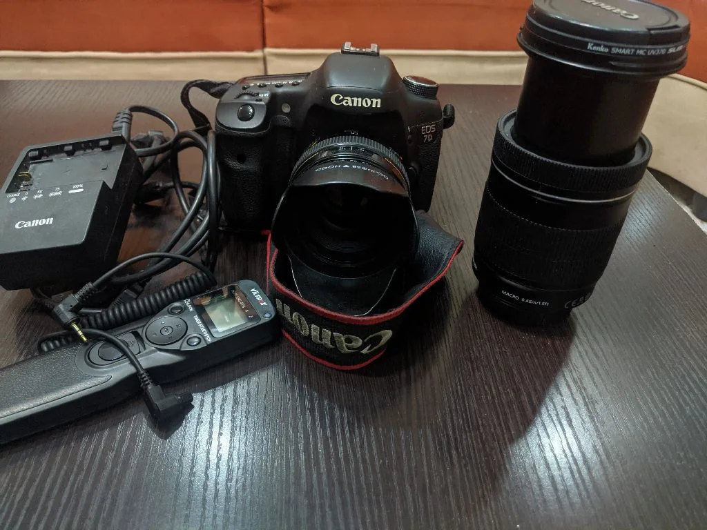 كاميرا Canon 7D مع عدسة Zoom و2 شاحن Canon وبطاريتين Canon وحقيبتها الأصلية وCanon سلكي مومري 4G /