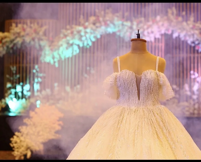 فستان زواج للبيع بحالة ممتازة لبسة واحدة تفصيل ثقيل من أشهر ممن مع ديل طويل مقاس M L