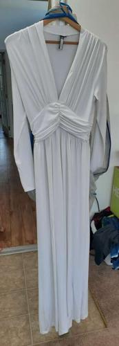 This dress was worn once and then washed and stored in the dress bag. Would be a great simple prom dress, wedding dress, or a nice evening gown. The tag says size 2, but I'm more of a 6 and it fit great. I'm also 5'4" and it hit the floor. No buttons or zippers...easy on/off. From a smoke and pet free home. I'm in Taylor *west of Ogden