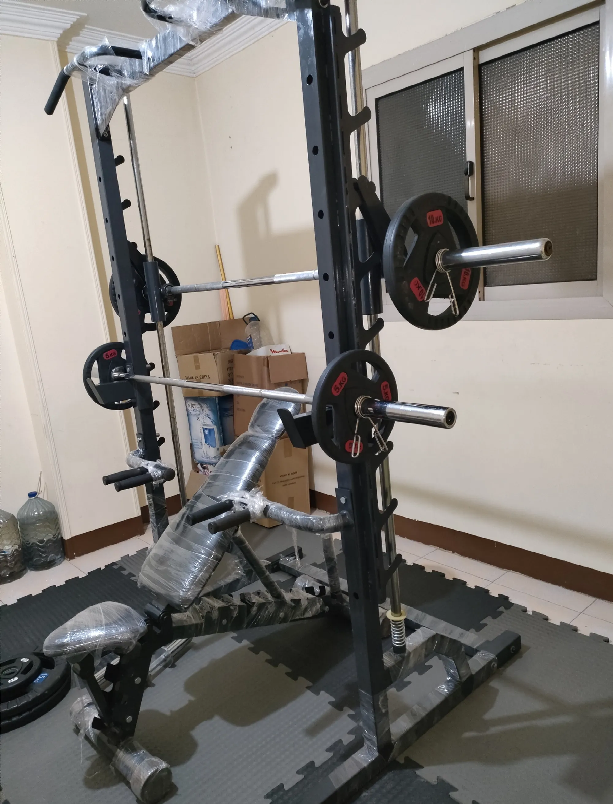 جهاز سميث عقلة ومتوازى تلعب عليه جميع التمارين مع دكه حرة بالطارات والبارات والهاند بار