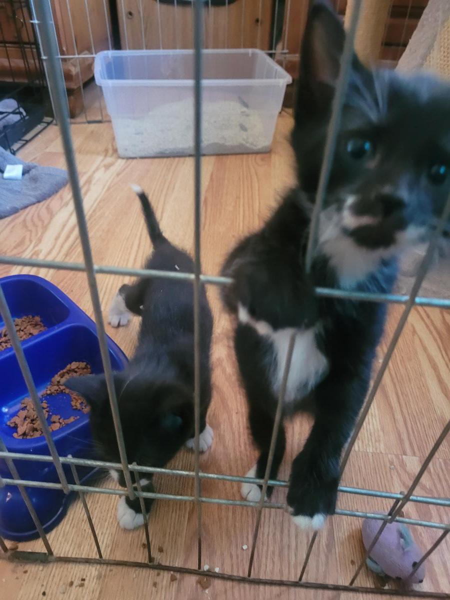 3 girls left. Moms not taking care of them. There 5 weeks. Eat and drink on the d e own. Play on cat tower. Loved. 2 have blue eyes