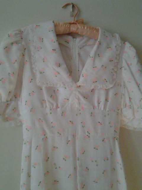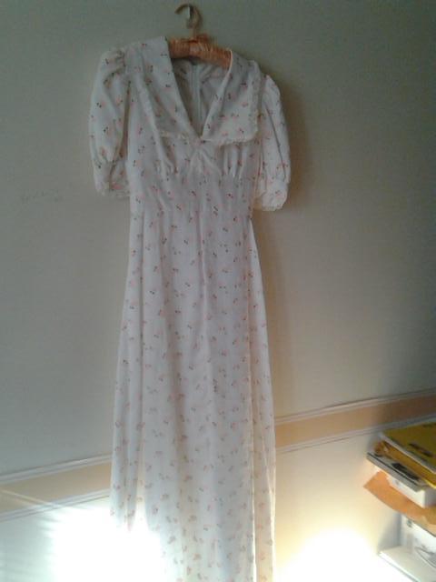 Finely hand-tailored, custom made to perfection. Glamorous yet modest Victorian gown in Small Size, W. approx. 24"-26", and floor length, about 56". Petite pink rosebuds, symbol of love, on a pure white backdrop and attached white slip/lining. Fashioned from the finest, delicate fabric with exquisite workmanship. Never Worn. $325 Cash Sale.