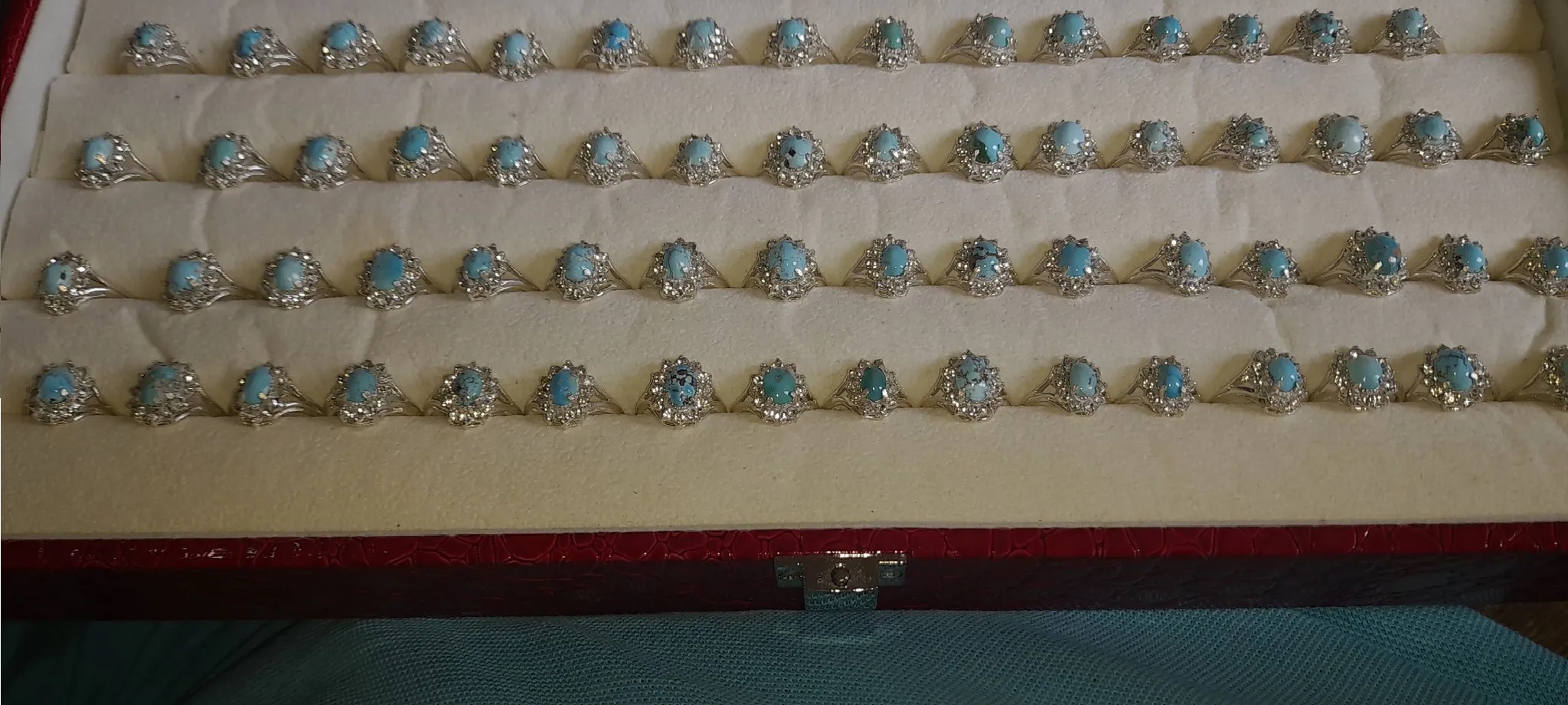 خاتم فضة نسائي عيار 925 ايراني بحجر فيروز نيشابوري حوليه ترصيع شفاف