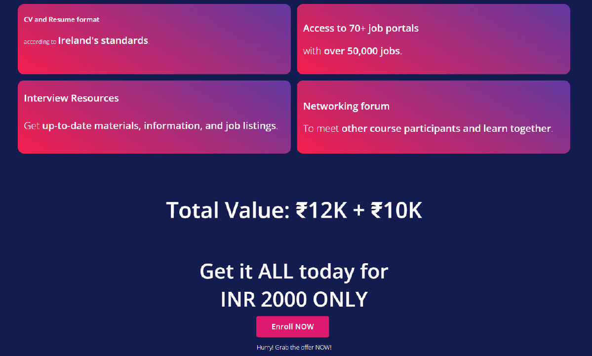 By the end of the Ireland Masterclass, you will be empowered to tailor your resume to Irish standards, pursue job opportunities with confidence, and understand precisely what Irish employers are seeking. Our experienced mentors will guide you every step of the way, ensuring you stay ahead in the competitive landscape and make a successful transition to the Irish job market.