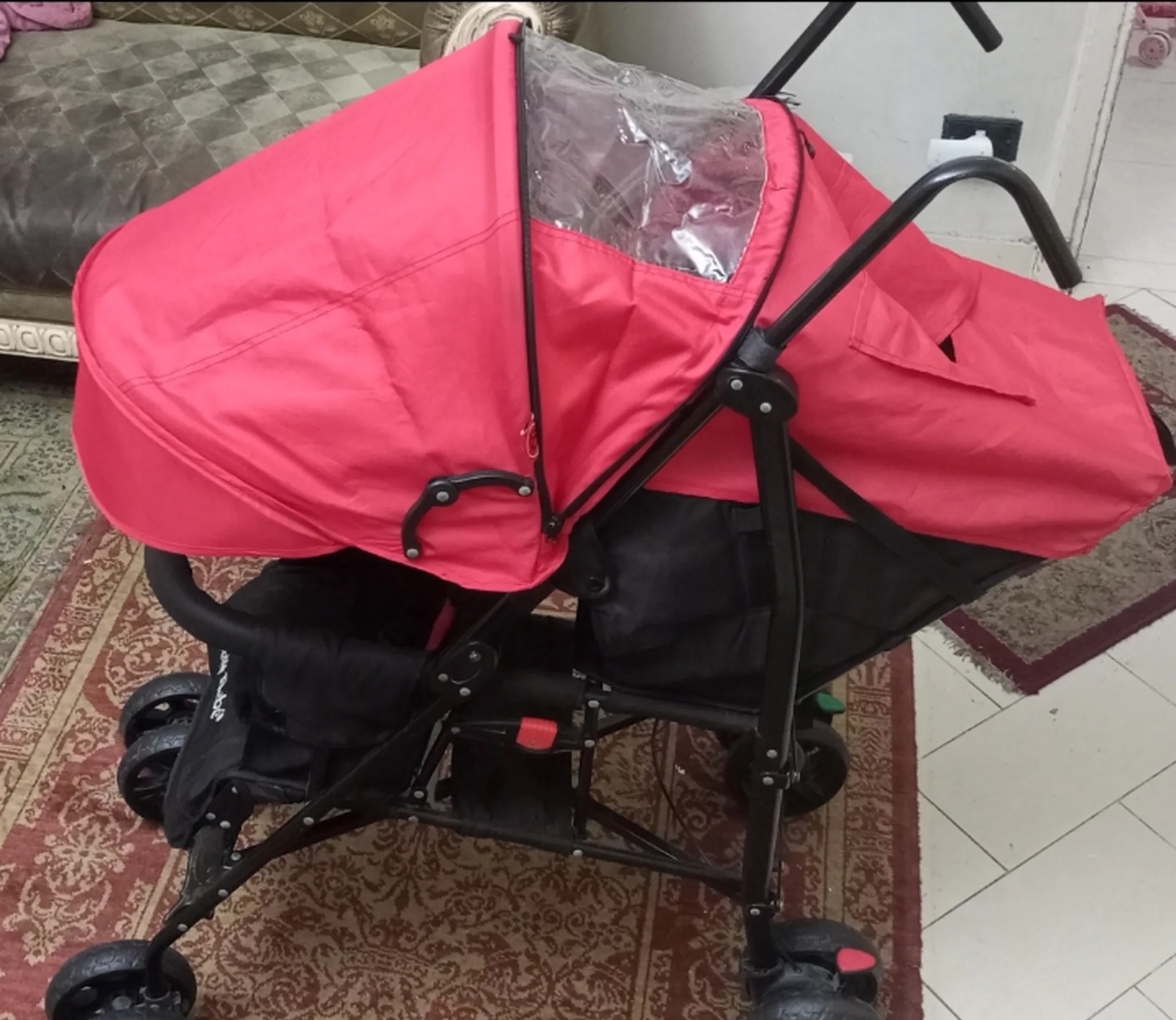 عربة متوسطة الحجم لوضع طفلين مريح وللخروج وتندة كبيرة للحماية ويمكن طيها لوضعها في شنطة السيارة بسهولة في الخروج