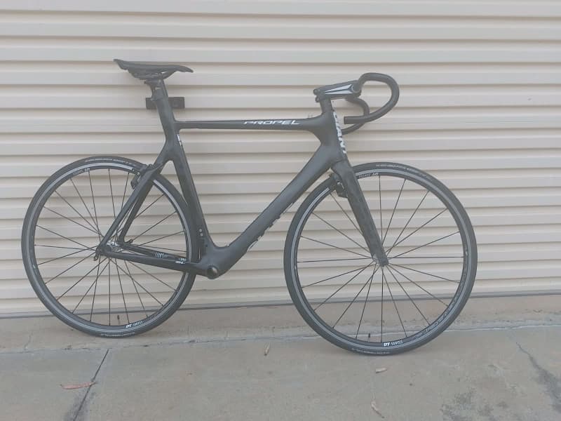 Full carbon frame and forks, Giant Propel frameset. Comprises Propel frameset in Giants' lightest grade 'SL' carbon (with inbuilt Trp brakes), very light DT Swiss wheelset (weighed at 1490 grams), Giant carbon railed saddle, Giant carbon stem and new Giant bars. Excellent condition. Just ad drivetrain of your choice to make a very light fast and unique machine. $825 negotiable. Phone call or sms preferred please, as Gumtree messages don't seem to get through. Thanks.