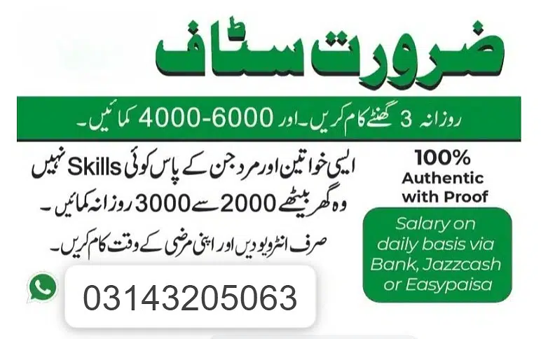 کمپیوٹر،لیپ ٹاپ یا موبائل پر کام کرنے کے لیۓ میل اور فیمیل سٹاف کی ضرورت ہے.