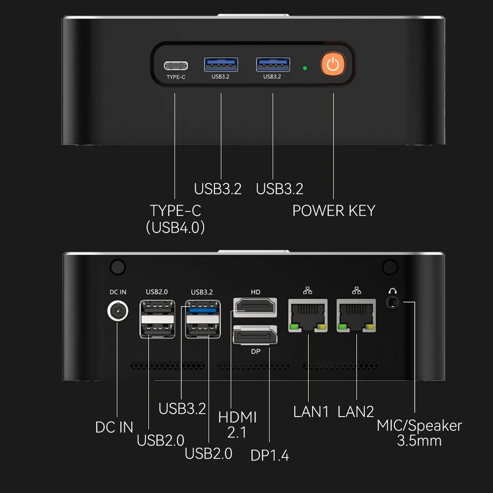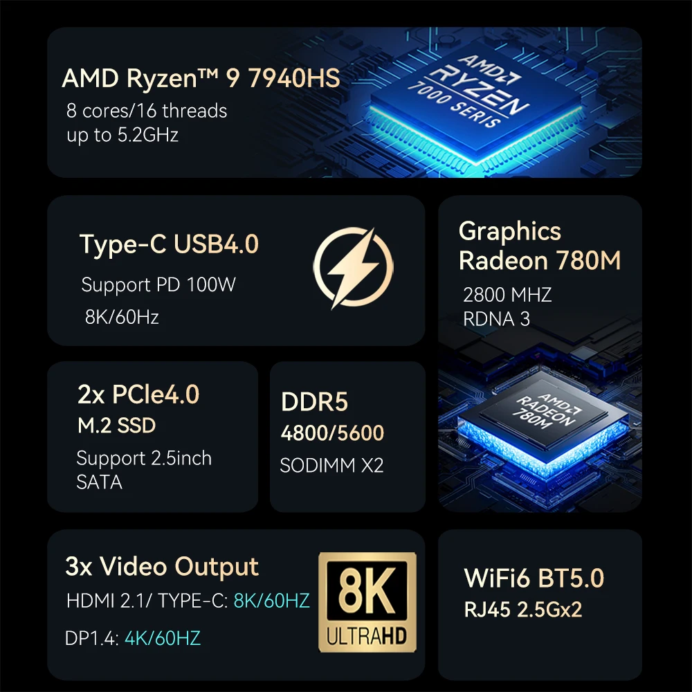 AMD Ryzen 9 7940HS 7840HS Mini PC 2x DDR5 Slots 2x M.2 SSD PICE4.0 Windows 11 WiFi6 BT5.0 Type-C USB4.0 8K Support