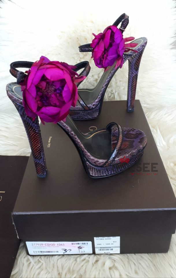 BRAND NEW breathtakingly gorgeous G*cci purple black p.ython ðŸ platform sandals in size 39. These exquisite beauties with detachable flower embellishment, 140mm heel including 40mm platform, will definitely make you the talk of the town.Includes box & dust bag.Retailed at AED 5500 (US$ 1495). Selling Price: AED 1600Collection from Al Barsha 1, Dubai