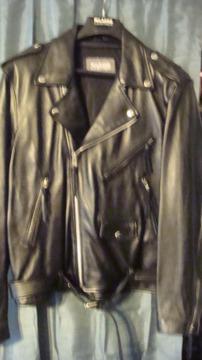 MAN'S WILSON'S LEATHER MOTORCYCLE JACKET XL, EXCELLENT CONDITION!!!!! A very awesome black leather jacket! Just worn a very few times.Zipper up Jacket /2 front zippered pockets and sleeves/slanted zipper chest pocket/small pocket with snapPleated back/adjustable beltOne hidden inside pocketClassic motorcycle style- heavyweight leather jacketMEASUREMENTS