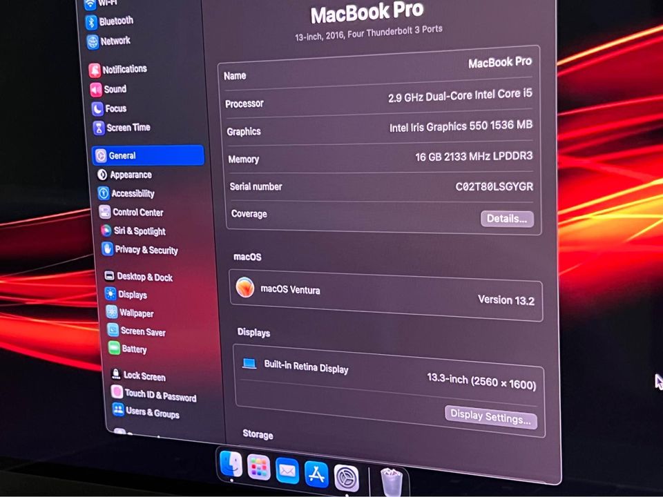 MacBook Pro (13-inch, 2016, Four Thunderbolt 3 Ports) Touch Bar fingerprint macOS Ventura Version 13.2Processor 2.9 GHz Dual-Core Intel Core i5Memory 16 GB 2133 MHz LPDDR3Storage Capacity 256 gb Battery Cycle Count 659Condition Attache picGraphics Intel Iris Graphics 550 1536 MBLaptop And First Class ChargerSameer Khan