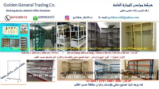 توريد وتركيب جميع أنواع أرفف التخزين للمخازن والمصانع والشركات والمستشفيات والفنادق والمستودعات الطبية. أرفف التخزين لمستودعات العطور والفحم والأحذية وأكسسوارات الموبايلات والكاميرات وجميع المستودعات بأنواعها. أرفف تخزين لأغراض المنزل والمطبخ لحفظ الكفرات والشراشف، أغراض المنزل والمطبخ. أرفف للجمعيات ومخازن الجمعيات والأسواق المركزية والبقالات بجميع أنواعها. أرفف لعمل المكتبات وحفظ الكتب / موبايل: 00 965 6040 6813