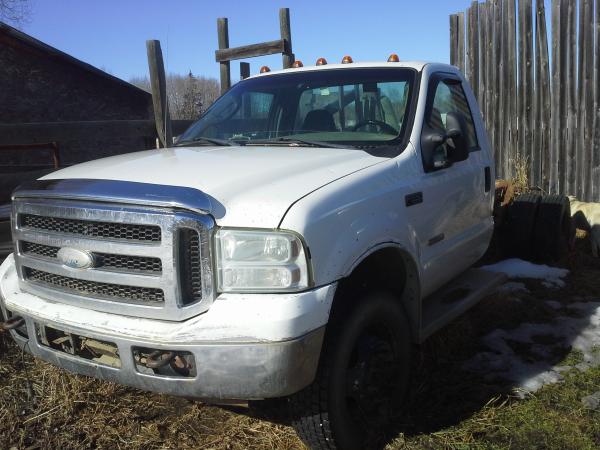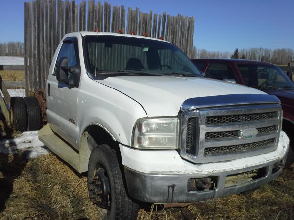 FOR SALE 2004 F- 550 4x4 CAB & CHASS, HAS 06 FRONT GRILL,BUMPER,LIGHTS,HEADER BEEN SITTING FOR TWO YEARS IN YARD RAN GOOD BEFORE PARKING HAS POWER BRAKE LOCK / PTO,newer turbo, rear diff with 4/8/8 gears,delete kit, high presure oil pump, positive air shut off,newer 6 speed tranny, cluch,good tires with spare,mite have pluged injector or two 5,000 or best offer. great truck For any questions plz call 403 877 1336
