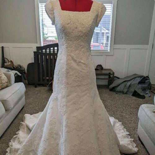 This dress has so much going for it! Beautiful lace with a touch of pearls, petal sleeves, and a lovely train!