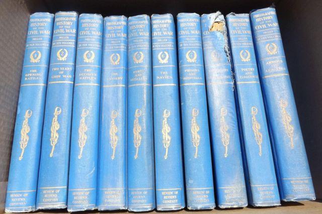I am selling a complete 10-volume set of PHOTOGRAPHIC HISTORY OF THE CIVIL WAR, published by Review of Reviews in 1911, including Vol. One - The Opening Battles; Vol. Two - Two Years of Grim War; Vol. Three - The Decisive Battles; Vol. Four - The Cavalry; Vol. Five - Forts and Artillery; Vol. Six - The Navies; Vol. Seven - Prisons and Hospitals; Vol. Eight - Soldier Life/Secret Service; Vol. Nine - Poetry and Eloquence of Blue and Gray; and Vol. Ten - Armies and Leaders. An amazing and unequaled collection of Civil War photography with extensive text. Overall the blue cloth covers are in good condition with one exception. They are all well bound and the pages are clean and clear. Full sets of these are very hard to find in any case, so this is a rare opportunity. I am asking only $195.