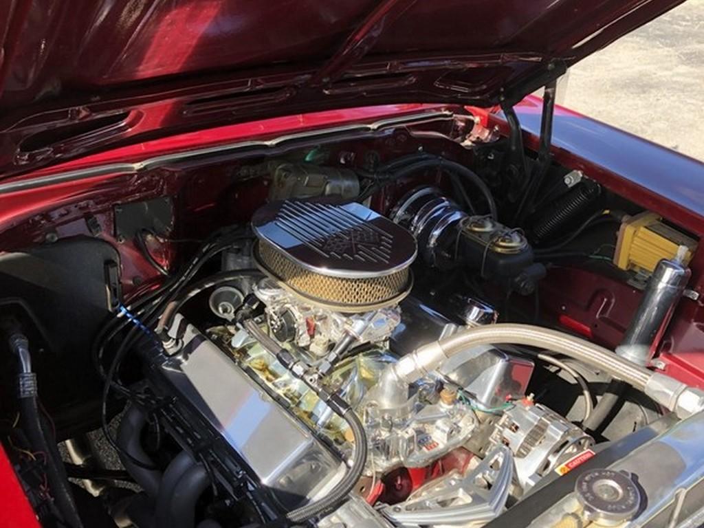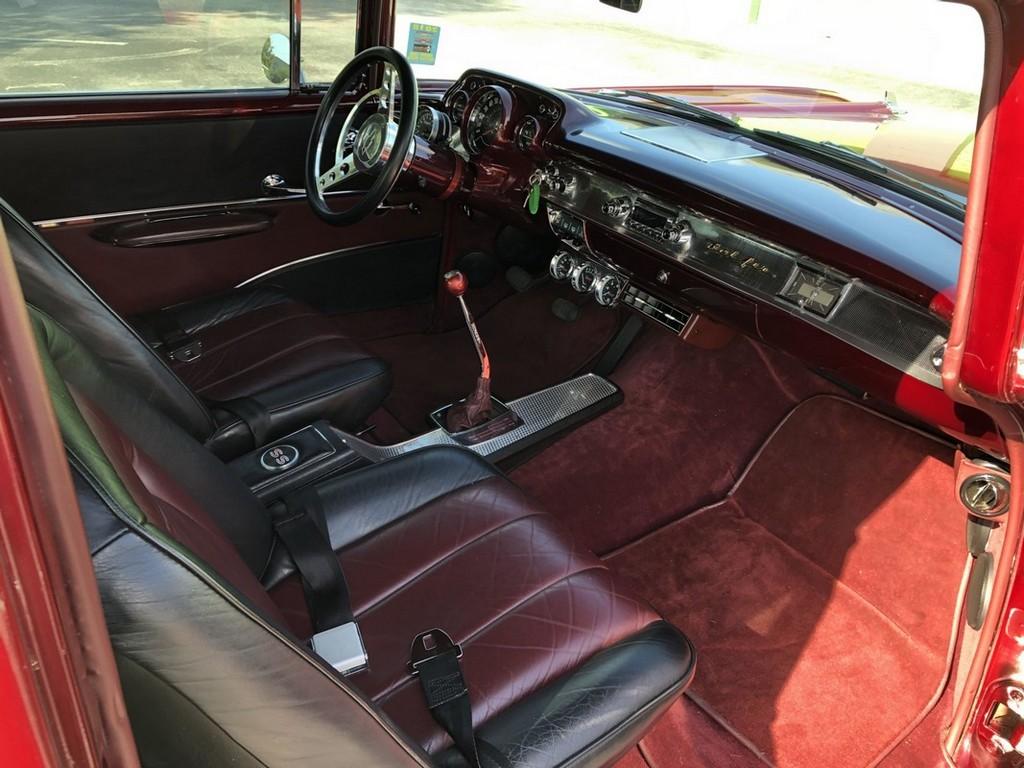 The interior has been updated with leather upholstery and matching carpets. Further additions include an aftermarket steering wheel, a tachometer mounted to the steering column, accessory gauges, a retro-style modern radio, Vintage Air climate control, and a custom center console housing a Hurst shifter.