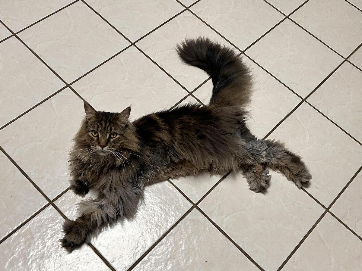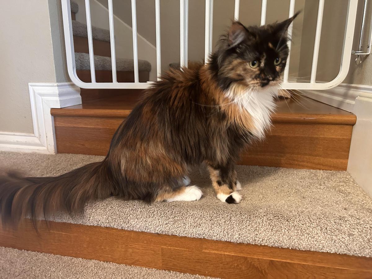 Two beautiful pure bred Main Coon cats (With Papers). Born at the end of 2020. Rehoming the pair, brother and sister. Both born at the end of 2020. Marmaduke (The Gray one) the boy, Baelfire (The Calico one) the girl. Both of these cats are very curious. Very very food driven. (like a dog is) They are very smart cats. Marmaduke is more sociable than Baelfire. He loves the mornings that's when he'll cuddle with you. Baelfire is a little timid. But she's very friendly. They both love to play with their toys. Both of them love to rest in high places. Both are polydactyl.