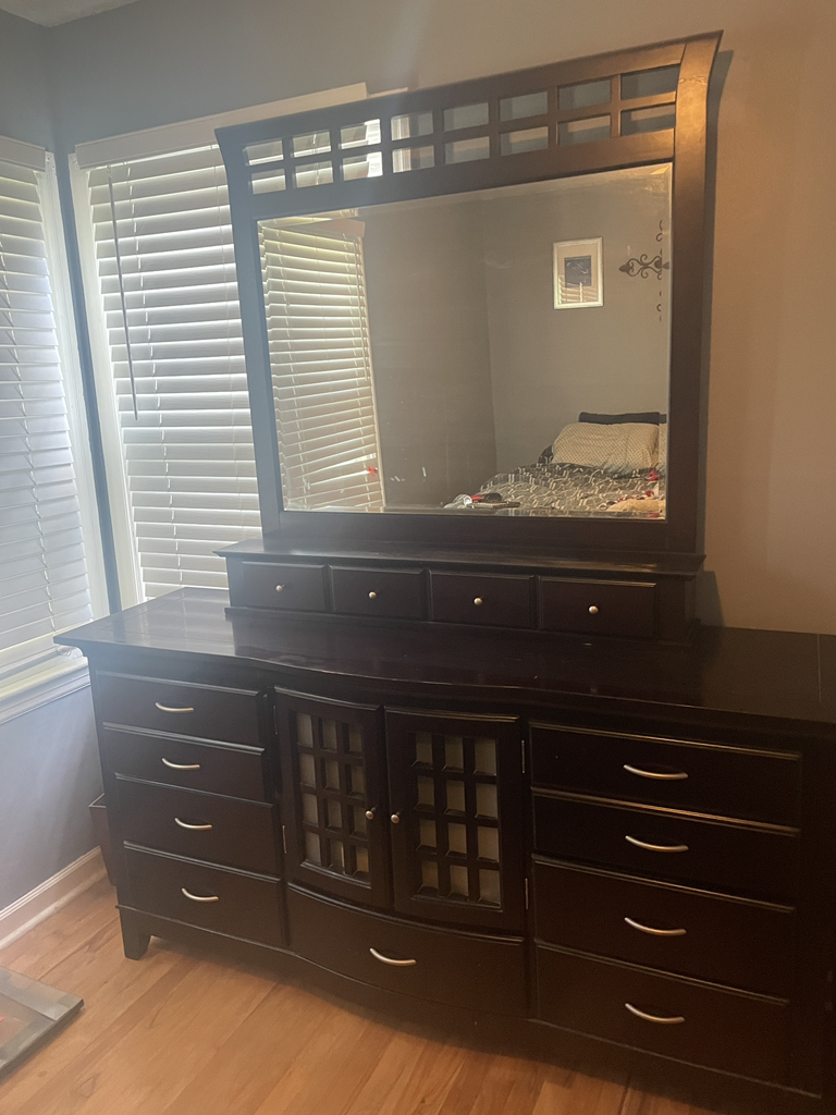 King-sized sleigh bed with headboard, footboard, box springs, frames, NO MATTRESS INCLUDED, armoire and dresser with mirror. Furniture is real wood. Bought at iu Row Bedroom Expressions. Top front of armoire has a few flecks of white transfer paint on it but should come out with a thorough cleaning. Dresser has two drawers on either side of chest with a cabinet in the middle and a drawer underneath that. There are two smaller drawers on top of the dresser—one on either side. On the armoire, there is a shelf in the large open cabinet on top and then three drawers down below. Here are the measurements for the pieces: