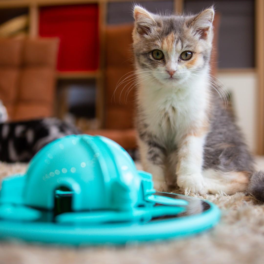 Cat hunting smart toy with an Additional accessories can be attached to the device to create different hideouts for the prey. Every hideout gives a different gaming experience making the device versatile. Hideouts let the cat observe the 'prey' from different angles and exercise the cat's ability to observe and hunt.