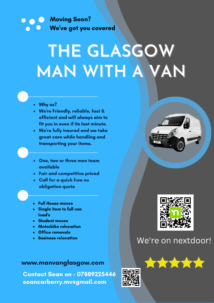 Friendly, reliable and efficient removal service in Glasgow & surrounding areas. 1 Man team prices starting from £40 per hour, 2 men team £60 per hour. Call for a free qoute. Website https://www.manvanglasgow.com