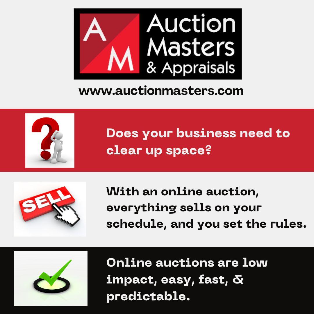 When you sell used items with Auction Masters, you can expect: Fast asset to cash conversions, Strategic marketing to potential buyers, Auction planning (photos, item descriptions, etc.), Guidance from detail-oriented auction experts.