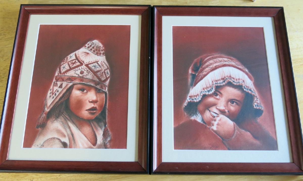 (2) two framed Inuit art pieces, depicting young Eskimo girls.  Beautiful reds and earth tones.  Pieces by artist S. Castilla.  Each measures 16.75 x 13.75.  Asking $25.00 / obo for the pair.  Buyer must pickup or pay all shipping costs (will be calculated per buyers location).  Call or text Brian @ (812) 760-5513 ~ located in Southern IN 47711