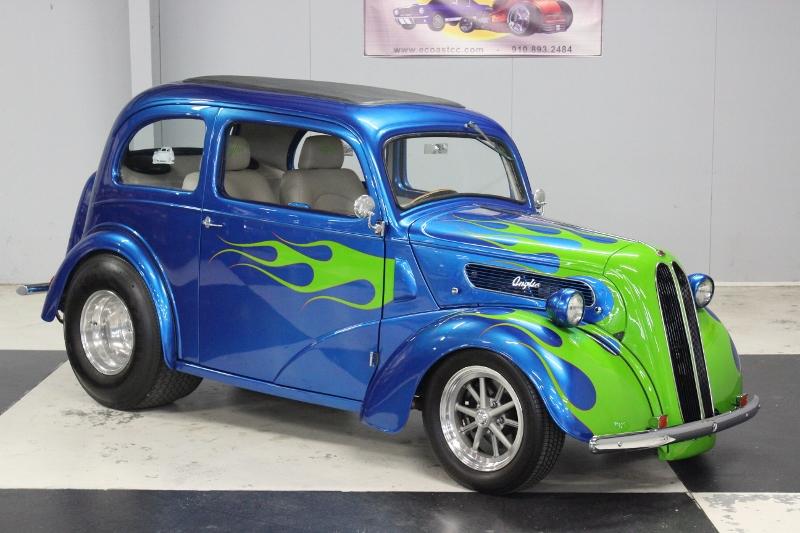 Painted a True Blue Firemist with sublime green flames, Billet mirrors with flames on driver and passenger sides, driver’s side wiper, stainless door handles and trunk handle, new front chrome bumper, grill is black with stainless trim, hood side louvers with stainless trim, chrome hood knobs, grill shell emblem, head light buckets painted, chrome door hinges, all the glass is good. Window felt and rubber, rear fenders are fiberglass, rest of the car is steel. Tubular rear bumper chrome, trunk hinges are chrome, top has center black vinyl louvers, E/T Gasser front rims with Fisk Classic steel radial tires that are like new. Center line rear rims polished with Mickey Thompson Sportsman tires, Billet head light knobs on dash. Front end tilts forward. Slick and beautiful car!